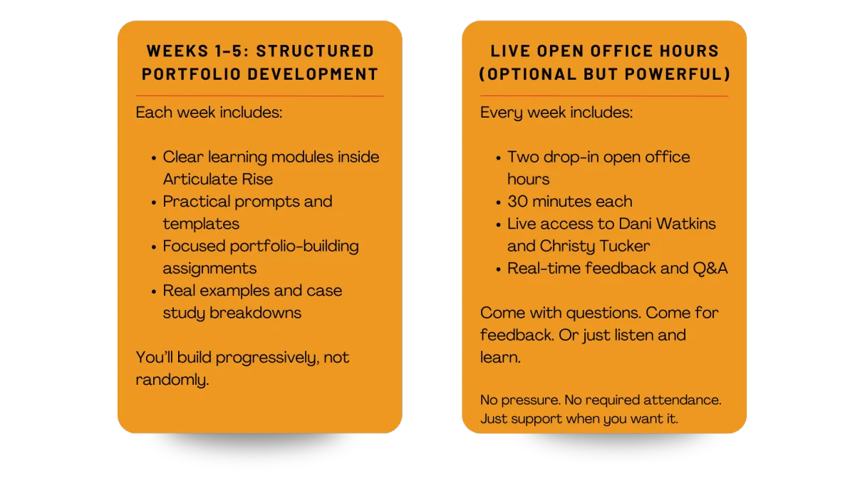 Starting March 30, you’ll move through a structured, step-by-step framework designed to help you build or refine an instructional design portfolio that clearly communicates how you think, design, and solve problems.